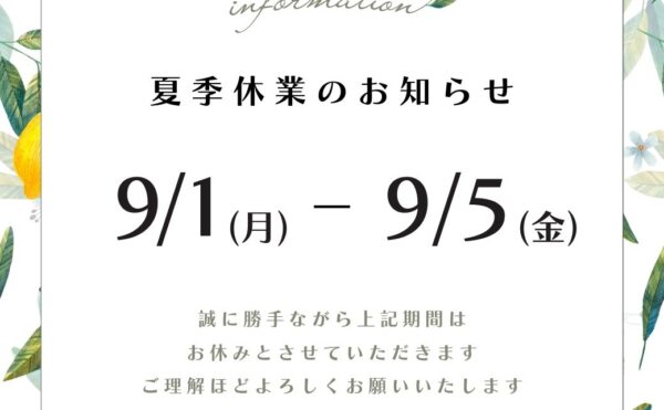 2025年8月28日お知らせSTORE STAFF 夏季休業のお知らせ9月6日から通常営業となります。ご来店の際は予約制となっておりますので、下記予約フォームよりご来店予約をお願いいたします。 お問い合わせの際はLINEにメッセージをくださいませ。お休み明けに順次対応させていただきます。