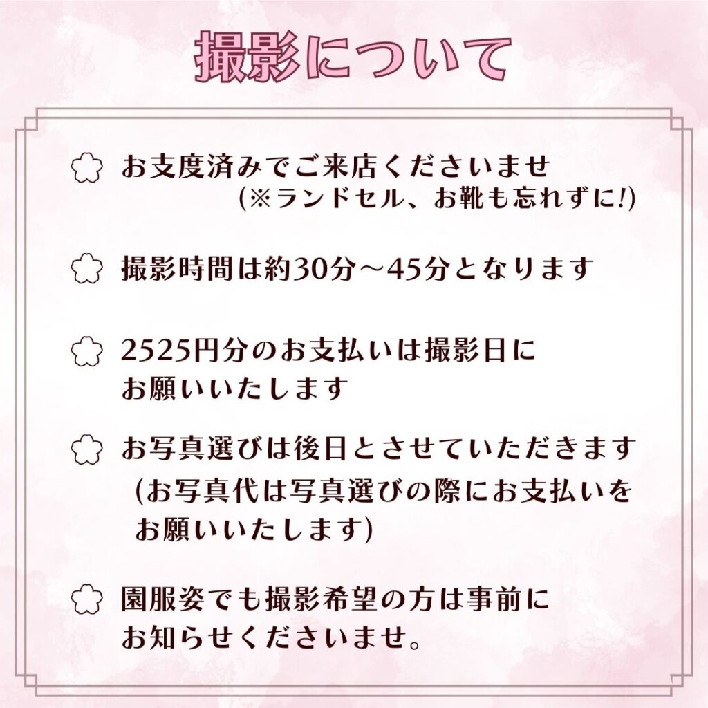 - 記念撮影をいたします。お支度を済ませてご来店してください。