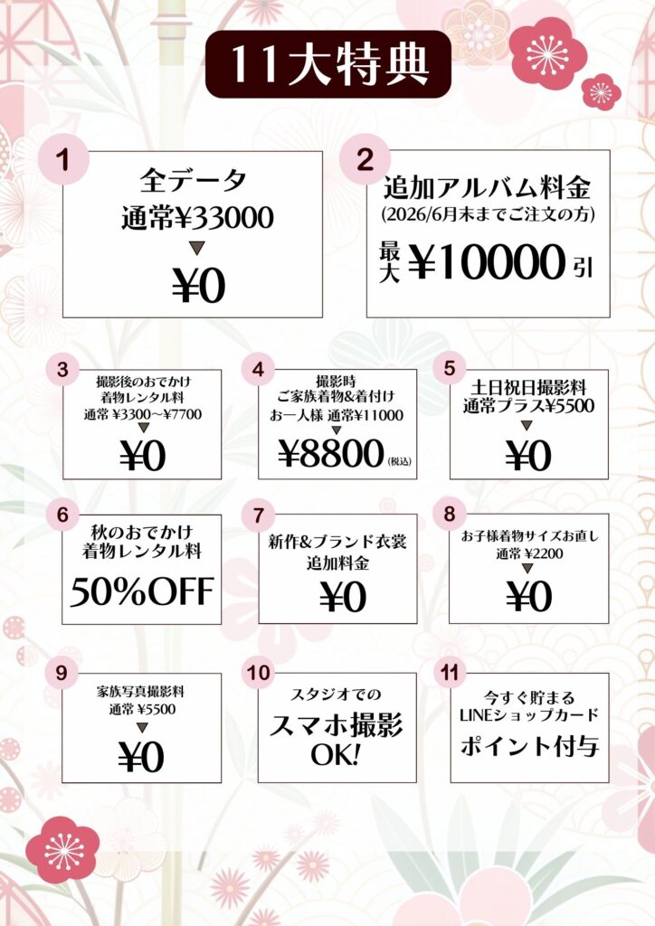 *2026春 春の七五三撮影キャンペーンをお申し込みの方限定!11大特典の一つとして¥11000以上のアルバムをご注文の際は割引がございます。(他の割引との併用不可)