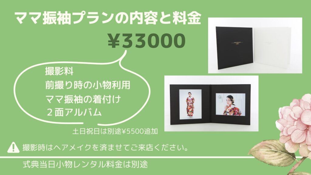 当店の記念撮影プランにママ振袖着付け代をプラス。
